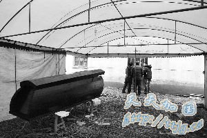 死者肖兆军的家门口,摆放着一具棺材,现场没有看到任何亲戚