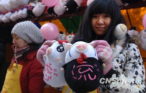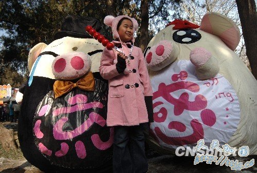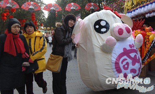 2月13日,中国农历除夕,2010年第25届地坛春节庙会开幕。在地坛春节庙会上,一对大型猪流感卡通娃娃吸引了青年人。人们或喜之,或避之,反映不一。