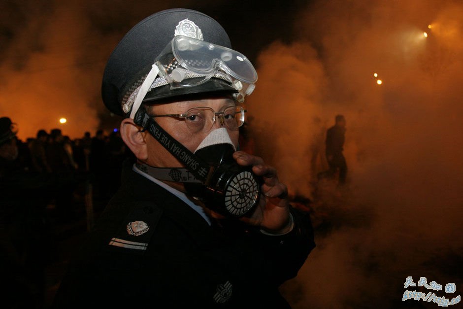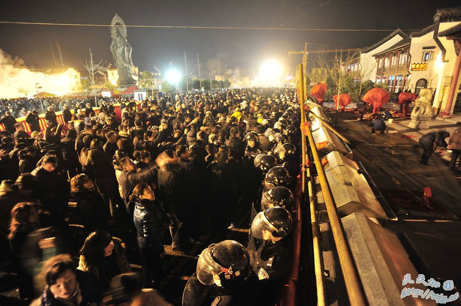众多市民向财神殿里投掷硬币,祈求新年好运,头戴钢盔、手举盾牌的警察守侯在殿外维持秩序