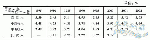 不同收入水平国家的公共教育支出占国内生产总值的比例