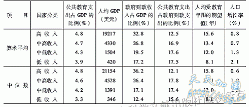 不同收入水平国家的公共教育支出占GDP比例等指标的比较