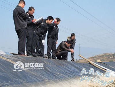 在死亡现场,警方调查表明,池面长方形池面,2.4米深,整个蓄水池用薄膜覆盖,表面光滑,蓄水池西北角,宽2.4米范围内,坡面23.8度,发现自上而下有多处擦刮痕迹,包括水面上下,以及攀爬等动作引起的痕迹,可以判定5名死者全部从此处下水,其他地方均未发现痕迹。