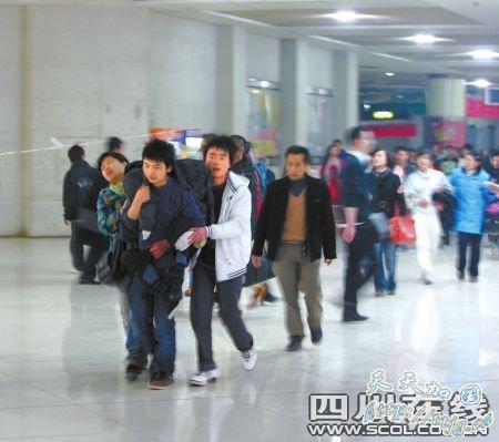年轻人一走出出站口,通道旁边顿时围上七八个人,其中两个年轻人快步走上前,帮忙扶住年轻小伙背上的人,另外一名身穿蓝色羽绒服的中年女子一边走一边打电话说:“接到了!接到了!”