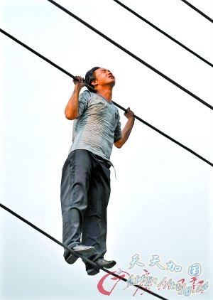 紧接着,男子双脚踩住下面另一条高压线,摇摇晃晃往前走,过了一个距离约50米的高压塔后又继续往前走了80米,时而双脚悬空、时而单手抓高压线、时而用高压线锁喉。