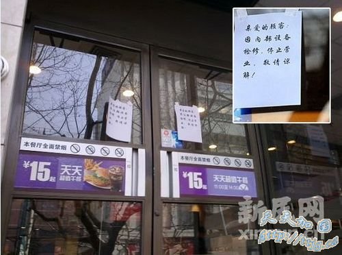 3月19日上午,发生血案的麦当劳餐厅门上张贴出停止营业的告示,上书“因内部设备检修,停止营业”字样。新民网记者胡彦珣 天钥桥路现场回传图片