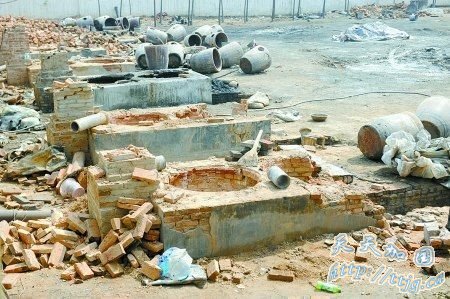 记者爬上旁边的一棵树,发现“东厂”院内荒弃已久,灶台被拆除了,现场堆满了废弃的红砖、烟筒以及几口铁锅,约40口陶缸横七竖八地丢弃着。记者注意到,这些陶缸上均挖出两个洞,曾在“东厂”打工的叶四连说,陶缸上的洞用来接管子,最终生产出的汞,通过管子导入缸内。