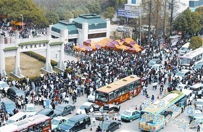 从昨晨7时至下午5时,去武大看樱花的人流不断。武大校门前,交警竖起三块告示板,请车辆绕行。涌进武大的游客将八一路拦成两截。张女士在广八路坐上一辆572路公交车,走一站路花了半个多小时。