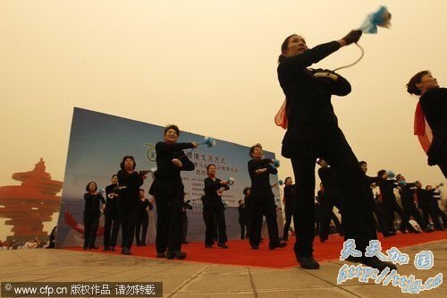 在浮沉天气中上演大型健康运动表演。