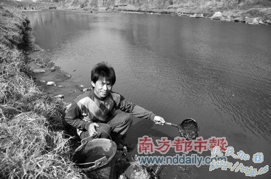 渡口村村民张怀军从黑腻腻的河里舀了一瓢稠稠的东西说:“这个风干了可当煤用,我们叫它‘河煤’”。 本报记者 纪许光 摄