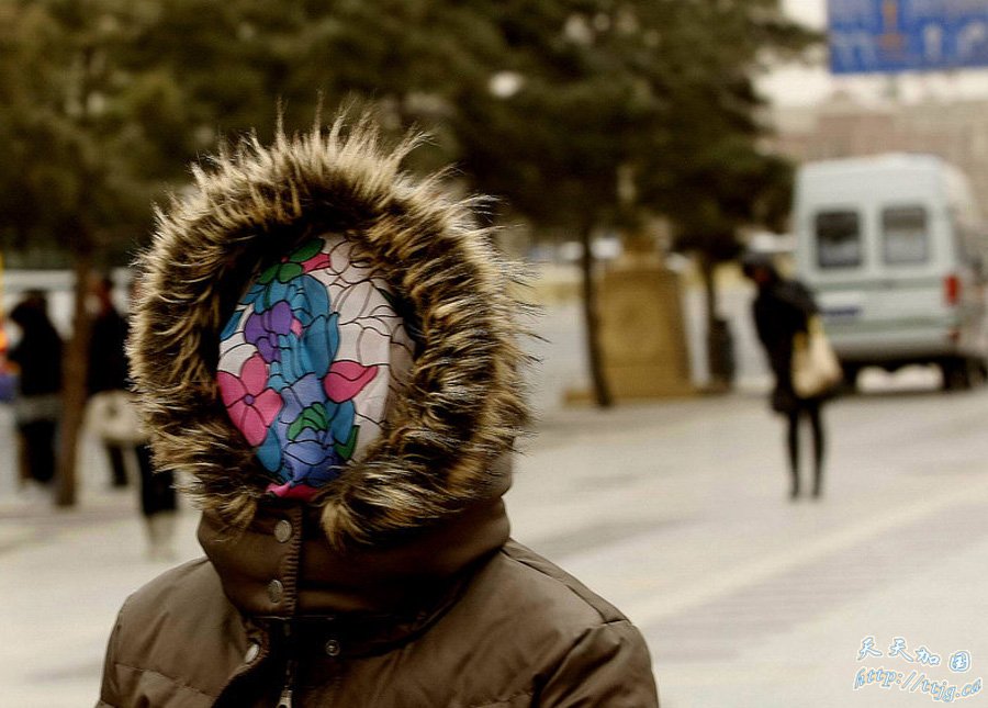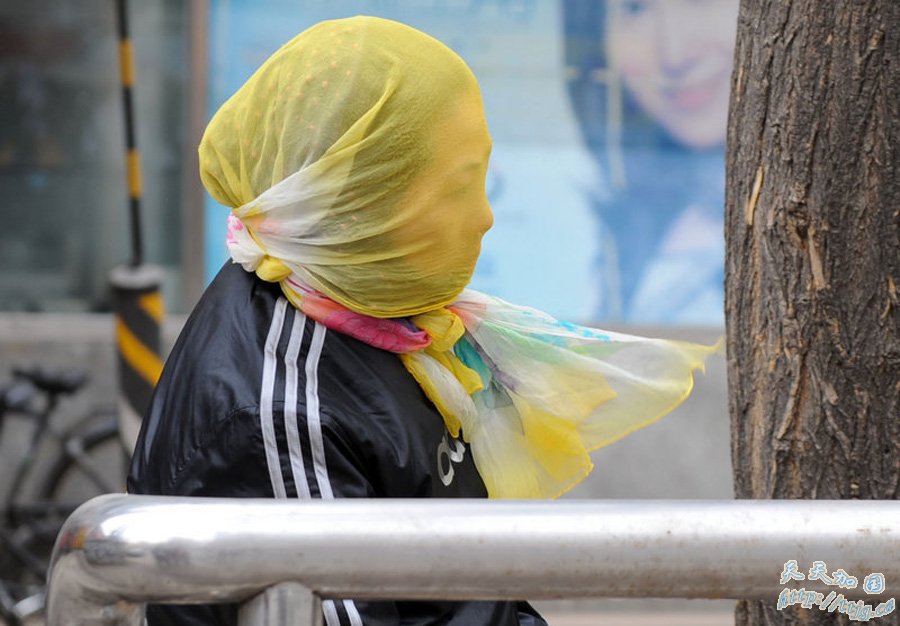 22日,天津,为防沙尘,一位市民头戴纱巾,嘴戴口罩。