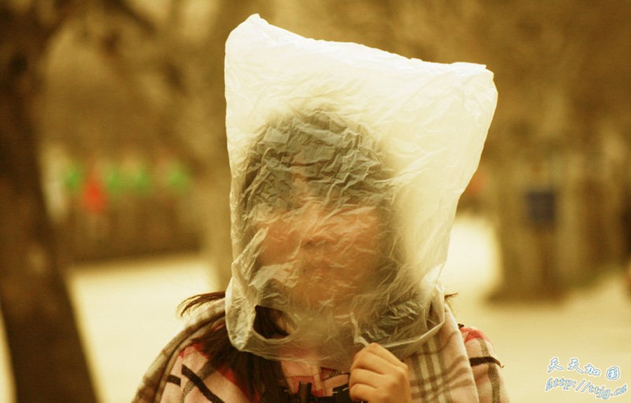 20日,北京遭遇4年来最强浮尘袭击。一位行人将自己用纱巾“武装”起来。