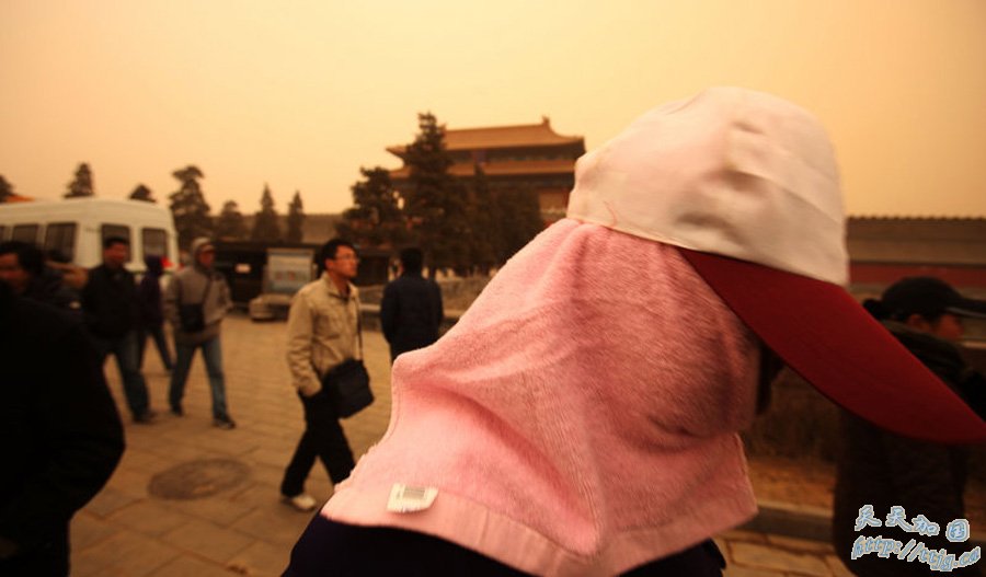 20日,北京遭遇4年来最强浮尘袭击。游客面带口罩在沙尘暴中游览故宫。