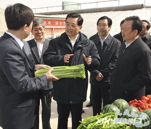 这是胡锦涛到银川小任果业有限公司考察时,勉励企业在发展现代农业、带动农民增收上做出更大成绩。新华社记者李学仁摄