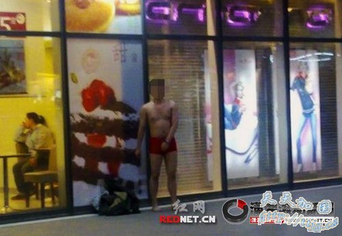 另据一名名“无限”的网友发帖称,3月22日下午五点多,江苏常州闹市的莱蒙85度C面包连锁店前,一男子在店门口只穿一件红色平脚内裤,看上去挺正常的、戴一副眼镜、手上拎的衣服包之类的都很干净,不像是流浪汉一类的人。很多路人都会回头看他、他倒也挺自然的。