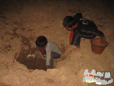 灾区孩子正在水窖中取水人民网3月25日报道 “不忍心拍这些照片,因为我没帮到孩子们什么!”日前,网友“haotian”在彩龙论坛上发了篇题为《旱情加重,学生喝水告急》的图片帖,称是在云南南华县洒披武村拍摄的,因为缺水学生们很久不洗手了,吃饭后只能到河里或几近干枯的井里打些浑浊水来解渴,照片被各大网站转载后,不少网友称看着让人想哭。