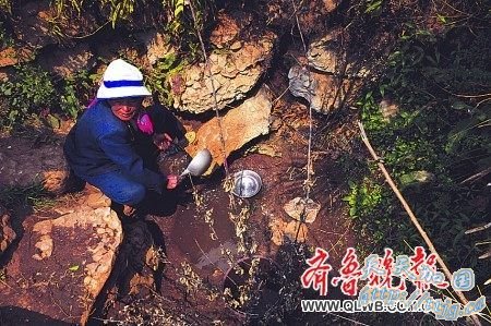 上午11时,村子一竹林底下的小水潭沁出了一些水,龚玉春让儿媳妇赵红英去舀回来,这是村里仅有的两处活水之一,是全村172户人家的生命之源,村民围着沁水口用石头垒成深井。一个上午,小水潭积了约4桶水,赵红英几瓢下去,勉强舀够半桶清水,被搅起的泥浆已让小水潭映不出她的倒影,但她还是继续把桶舀满。