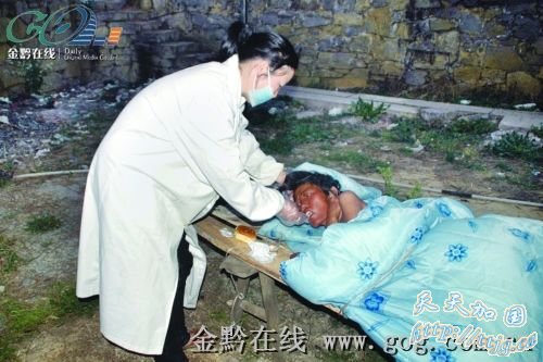 3月22日晚6:30,记者来到八步镇卫生院,在卫生院大楼后侧一块空地上,这名受伤的妇女躺在用木板搭成的简易床上。妇女面容枯槁,不时大声哀叫。