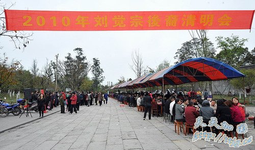 昨日一早,安仁古镇的刘氏庄园旁有一条宽敞的街道异常热闹。一张写有“2010年刘觉宗清明会”字样的红色条幅横挂在街头,街道一侧搭建的棚子延伸了 100余米,棚下紧凑地安放着75张圆桌。