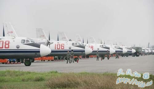 3月26日,四川彭山某军用机场,14架等待加装增雨设备飞机集结在机场.