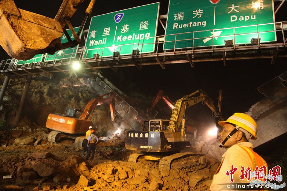 连接台北和基隆的一条高速公路25号下午突然发生山崩,大量土石砸毁一座公路高架桥,掩埋六条行车道,目前传出有7辆车怀疑被埋,当局出动大型挖土机漏夜挖掘,并调派军人协助搜救。有怀疑失踪者家属赶到现场,哭求当局赶快救援。马英九第一时间赶往事故现场勘察,目前,救灾单位还在开挖抢救。
