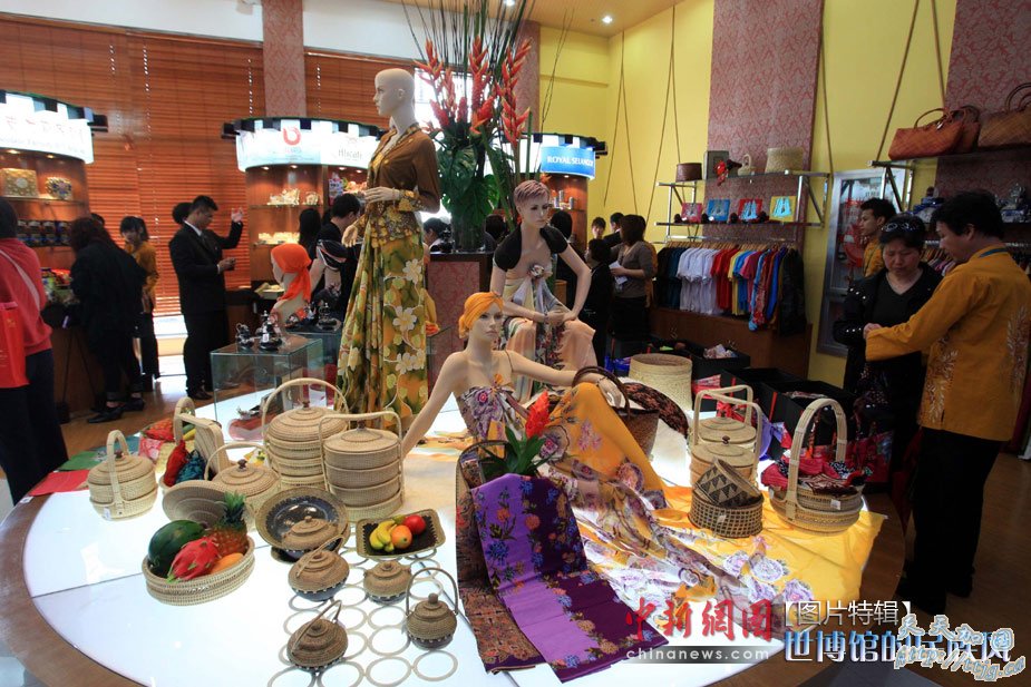 5月1日,上海世博会马来西亚馆开馆,馆内丰富的旅游产品给中国观众带来新奇的购物体验。