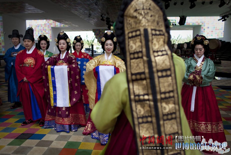 在韩国馆内接待人员身着民族特色服饰迎接参观者。
