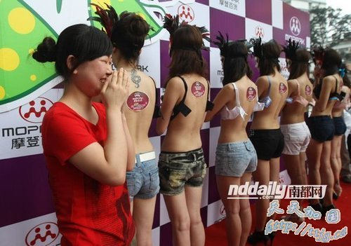 8日下午,在广州岗顶一百货公司在其门口策划了一场“挑战吉尼斯单手解内衣”大赛,参赛选手只要在一分钟内单手解开8位模特身上的内衣扣环,就有机会获得一份大奖。一位女选手21秒解下8件内衣夺冠。