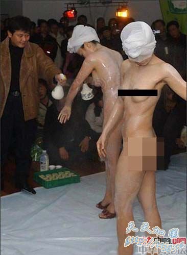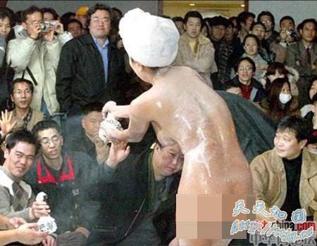 最近大陆论坛盛传一组照片,内容是三名女子头包白色浴巾,不但全裸,身上还抹满乳白色的液体,前方则一群看起来相当乐不可支的男性民众围观。据了解,这是大陆某商场2008年的促销活动,当时为要推销沐浴乳,竟请来三名女子「当众洗澡」!