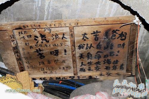 除了这套床铺,贴着井壁的还有一块木制门板,上面写满了黑色的毛笔字,诸如“流浪人苦啊”、“妈,我想你,每天晚上哭”、“我不要流浪,人生无路可走”等。从字迹上看,是同一人所写,但不能确定是否为这个电缆井中的蜗居者所写。