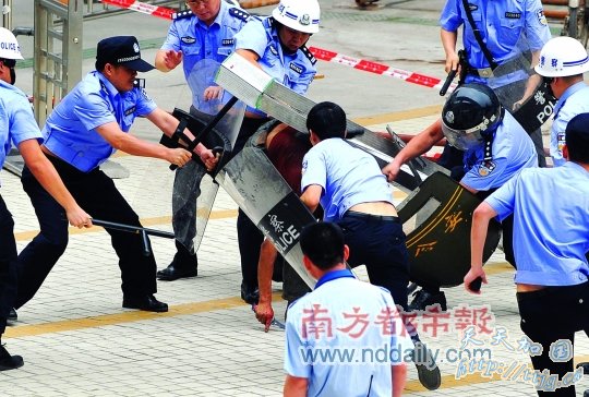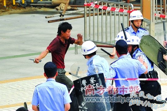 就在这时,两名持盾牌的警员从后面冲了上去,其他警员也一拥而上,用梯子架住“犀利哥”。“犀利哥”拿着匕首一阵乱舞,用脚踢警员,很快从10多人中“突围”,接着又持刀向一名没拿盾牌的警员刺去,但被警员躲开。
