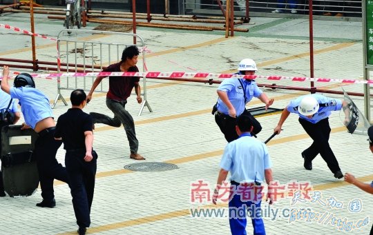 中午11时50分许,在警察的“围攻”中,一名警员将“犀利哥”的匕首夺去,其他警员顺势将其按倒在地。一名警员在制服过程中摔倒擦伤。“犀利哥”被押上警车时对记者说,他是高州人,28岁。而车站保安、拉客仔及小吃摊主均称之前未见过此人。
