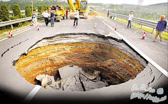 6月4日凌晨零时过,浙江省黄衢南高速往南平方向1478KM+520M处突然发生路面塌陷事故,路面塌陷形成了一个直径8米、深10米的大坑,刚好位于高速公路上。