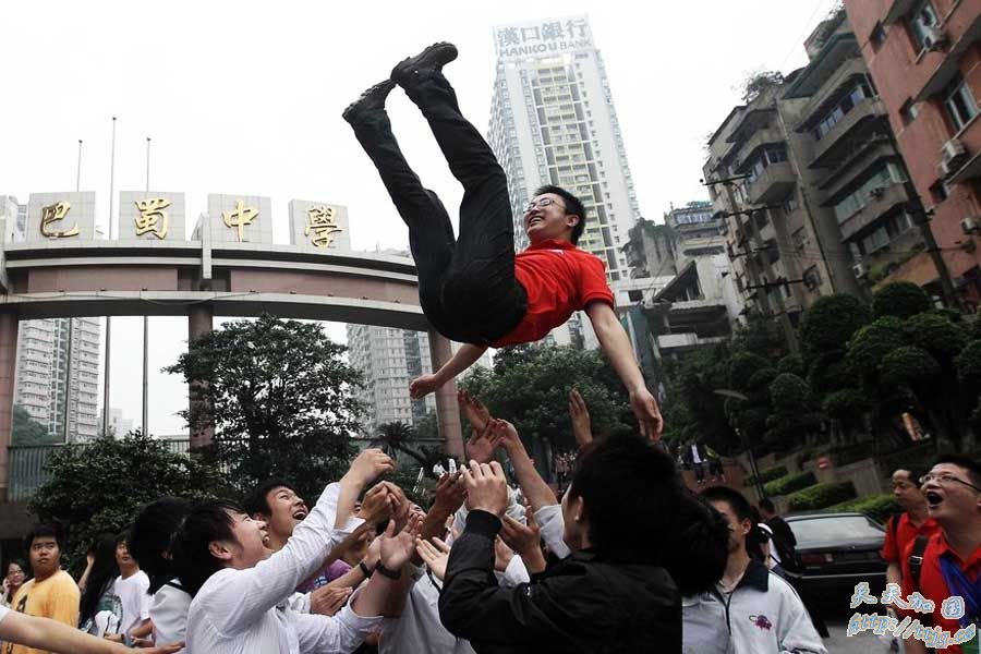 6月8日,重庆,巴蜀中学的考生们把老师抛向空中庆祝。