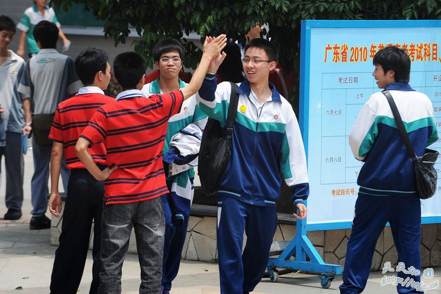 6月8日,佛山市第三中学考场,走出考场的考生和班主任击掌庆祝。