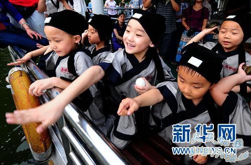 6月15日,小朋友们身着学童服,在武汉东湖向湖中投粽,祭祀屈原