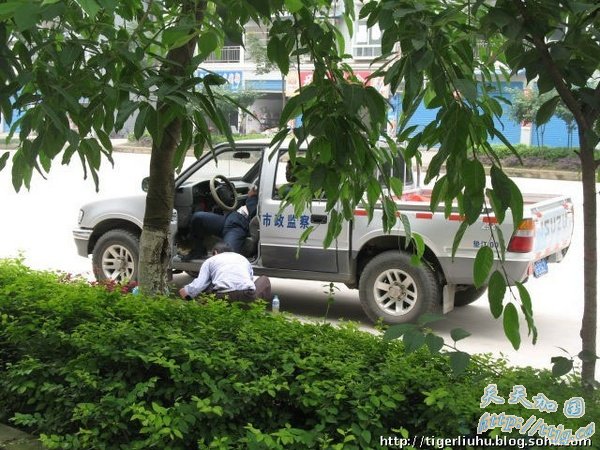 附有相关照片的帖子最先于6月4日发表在垫江论坛上。照片清晰地显示,车门上印有“市政监察”字样的一辆皮卡停在路边,一人斜躺在驾驶员座位,伸出一条腿到车外,一名男子坐在小矮凳上深俯着腰在为其擦鞋,头在车内男子的膝下。另一张照片显示,副驾驶室座位上也另有一名男子伸下脚擦鞋。