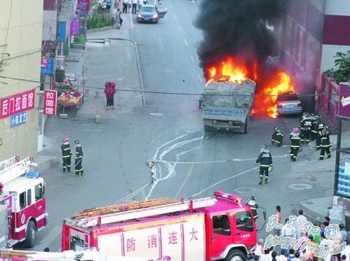 一辆货车突然自燃,不但自己被烧毁,还点着了路边停放的一辆轿车。这一幕发生在昨日18时30分许,地点位于甘井子区同德路与松江路交叉口附近,事故中没有人员伤亡。“自燃的货车从松江路拐到同德路后,很快便停了下来,车拐过来的时候,我就看到车头底部有黑烟冒出,之后很快就能看到明火,还能闻到一股难闻的焦煳味。 ”一位现场目击者说,货车停下来后,司机及车上的另外一人立即下车,并取出灭火器试图救火,“但当时火已经彻底烧起来了,灭火器根本就不顶用。 ”发生自燃的是一辆装有数百包水泥的大货车,火舌很快将货车吞没。货车旁不到一米处的路旁停放着一辆轿车,越烧越大的火,迅速引燃了旁边的轿车。“当时火很大,火苗能有四五米高。 ”