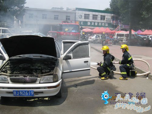 消防队员接警后迅速赶往现场,到场后发现汽车正猛烈燃烧,消防队员立即出动高压水枪灭火,20分钟后火灾被彻底扑灭。