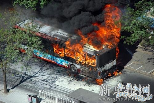 7月6日上午8时30分许,华威桥南50米处,一辆公交车突发大火。 读者赵先生摄。 北京持续高温,今早一辆公交车又发生自燃。北京消防部门提醒面对高温一定要严防火灾。 今早8点35分,北京市东南三环华威桥南侧一辆638路公交车发生自燃,司机在发现危险情况后立即将公交车停靠辅路安全地带,疏散车内乘客,并报警。北京市119指挥中心接到群众报警后迅速调派华威消防中队4部消防车火速赶赴现场扑救,8时50分,公交车火灾被消防员迅速扑灭,据初步调查,公交车车体后半部被烧毁,初步判断是公交车后置的发动机自燃所致。 据统计,进入7月以来,北京全市共发生火灾121起,其中杂物类火灾61起,交通工具类火灾26起,住宅类火灾16起,电器类火灾14起。 消防部门提醒广大市民,近期高温少雨,要及时清理单位内部、家庭阳台内的可燃杂物,避免夏季阳光直射或高温烘烤易燃可燃物品,引发火灾;此外,天气炎热,社会单位、家庭因制冷需要,用电量大增,电气线路负荷加大,老旧电气线路火灾隐患不容忽视,应做好检查维修更换工作;机动车要做好检查保养,不要长时间放置在阳光下暴晒,避免机动车路上 “发火”。