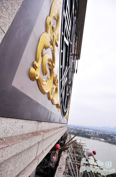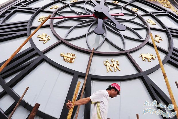 7月14日下午,世界最大机械塔钟拆除部分钢筋脚架后,四面精美的钟面呈现在世人面前。