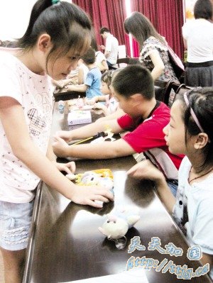 昨天,30多位小朋友还掏出了从家里带来的小物品,在虚拟的交易区做起了“小买卖”。最开心的要数6岁女孩尚钰桐,她带的东西很受大家欢迎,一个旧快板,一个万花筒共卖了8块钱,成了当天赚钱最多的小朋友。她一直握着8张1块的纸币,笑着说:“这些东西是爷爷给我买的,我很喜欢,但是现在卖出去了,我也很高兴。”