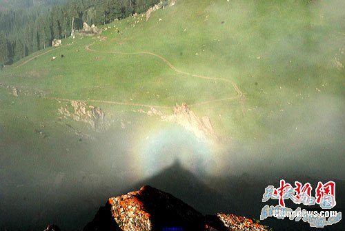 7月24日19时许,新疆天山天池云开雨霁,落日余晖下天池灯杆山上空突然出现一道美丽的彩虹,看上去如同传说中的佛光,令人赞叹不已。