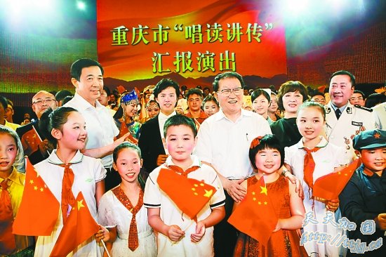 中共中央政治局常委李长春在市委书记薄熙来等陪同下,观看重庆市“唱读讲传”汇报演出后与演员合影。 闻俊伟 摄