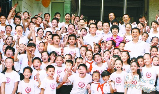 中共中央政治局常委李长春在市委书记薄熙来等陪同下,考察谢家湾小学时与师生在一起。 闻俊伟 摄