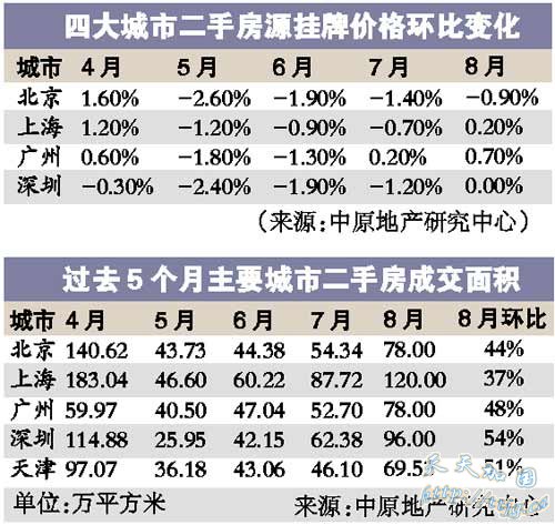 广州目前成交量反弹的幅度更大。根据地产对阳光家缘数据监测,8月广州网签接近7000套,环比增幅超过六成,创下4·17新政实施以来的新高。而成交均价也回升6.39%。