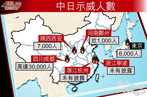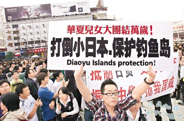 中国内地多个城市昨日爆发大规模反日示威,包括成都、西安、杭州、郑州等地共有数万民众为捍卫钓鱼岛主权和抵制日货走上街头。据悉,活动为各地高校学子在网上召集组织,而昨日的游行队伍亦以学生为主。与此同时,日本昨日同样爆发大规模反华示威游行,约6000名右翼分子游行到东京的中国驻日本大使馆外表示抗议。在日本右翼的一再煽动下,中日两国的民间情绪正日趋尖锐对峙。