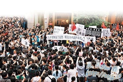 昨日,郑州爆发声势浩大的“抵制日货”大游行,数万人高呼口号,齐唱国歌。一位郑州大学工学院的学子告诉香港文汇报记者:“我很爱我们的祖国,我们是高素质的民族,我们要用我们的努力和实力提升国货的品质,把日货比下去,一个国家强大了才不会受制于人。”