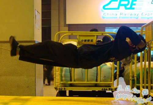 记者四处打听,才知道“睡绳哥”的真名叫傅洪,今年38岁,是贵州毕节人,今年6月份来到杭州后,就在城站当起了搬运工,睡绳的绝技早在家乡时就已经学会了。