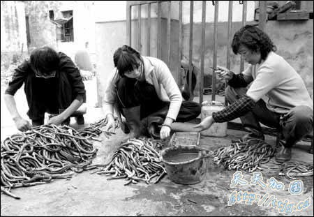 我们向他们打听,村里谁家里蛇多,他们指了指对面的一处老宅子。我们推开门朝里望了望,光线很暗,隐约看到三四只大池子。这时一位老奶奶来到门前,老奶奶带领我们参观了一下,这屋子有前后两进,水池里养满了蛇,老奶奶骄傲地说,这只是一部分,其他地方还养着很多蛇呢。我们问老奶奶捉放蛇用什么工具,老奶奶双手一摊,用手啊,说完,她双手伸入池中,“哗——”的一声,捞起七八十条蛇,为使我们确信用手无碍,这种水中捞蛇的动作她重复了好几次,看得我们心里直发毛。
