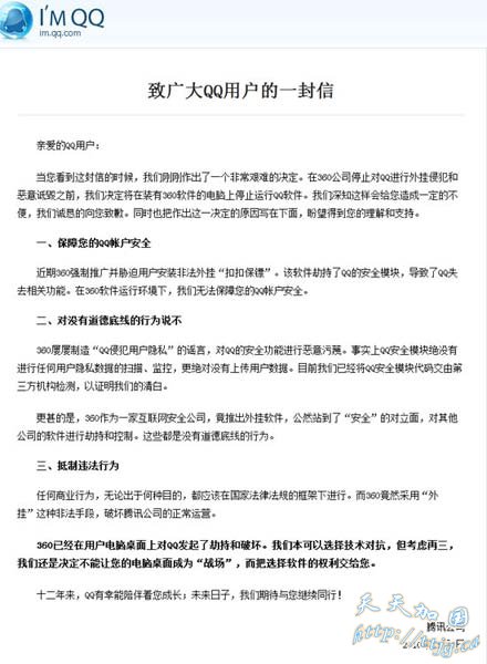 18:50左右 腾讯再发布一则声明,呼吁用户不要使用360软件,更不要通过360软件备份QQ资料,“以免个人数据被窃取”。